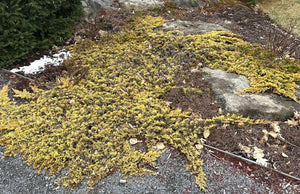 Low-growing carpet Juniper with dense trailing branches. Dense foliage is gold in the summer, turning golden-bronze in the winter. Excellent as a groundcover. Very slow growing when first planted, taking several years to reach full size.