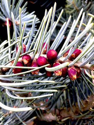 A large, conical evergreen witha a stately appearance, this variety has large, bright silvery-blue needles. Large purplish cones appear on younger braches of older specimens. They grow upwards and disintegrate white still on the plant.