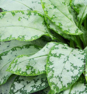 Wavy, lanceolate, dark green foliage with silver spots. Pink flowers turning blue.